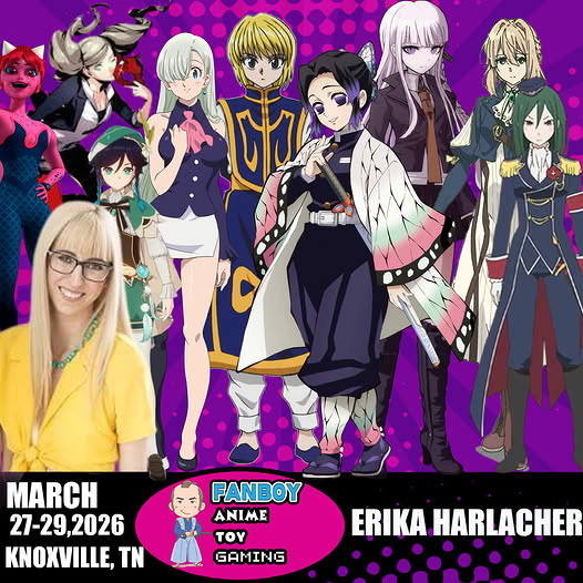 Erika Harlacher is best known for her roles in Persona5:, Hunter X Hunter, Seven Deadly Sins, Miraculous, Genshin Impact, Demon Slayer:, Re:Zero −, Danganronpa, Violet Evergarden, and many more!